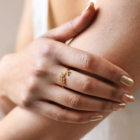 Adjustable Sterling Silver Crystal Fern Leaf Ring in Gold