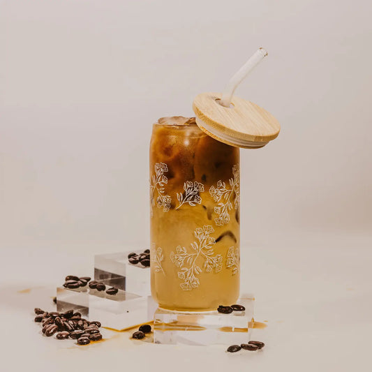 White Floral 17 oz Can Glass w/ Straw and Lid