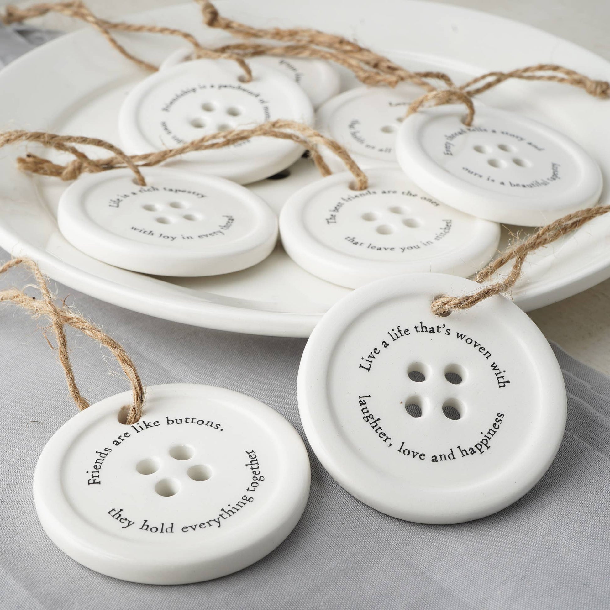 Introducing our Ceramic Display Dish with 8 Assorted Button-Style Hanging Decorations – Mixed Slogan Designs – Giftable Keepsakes.