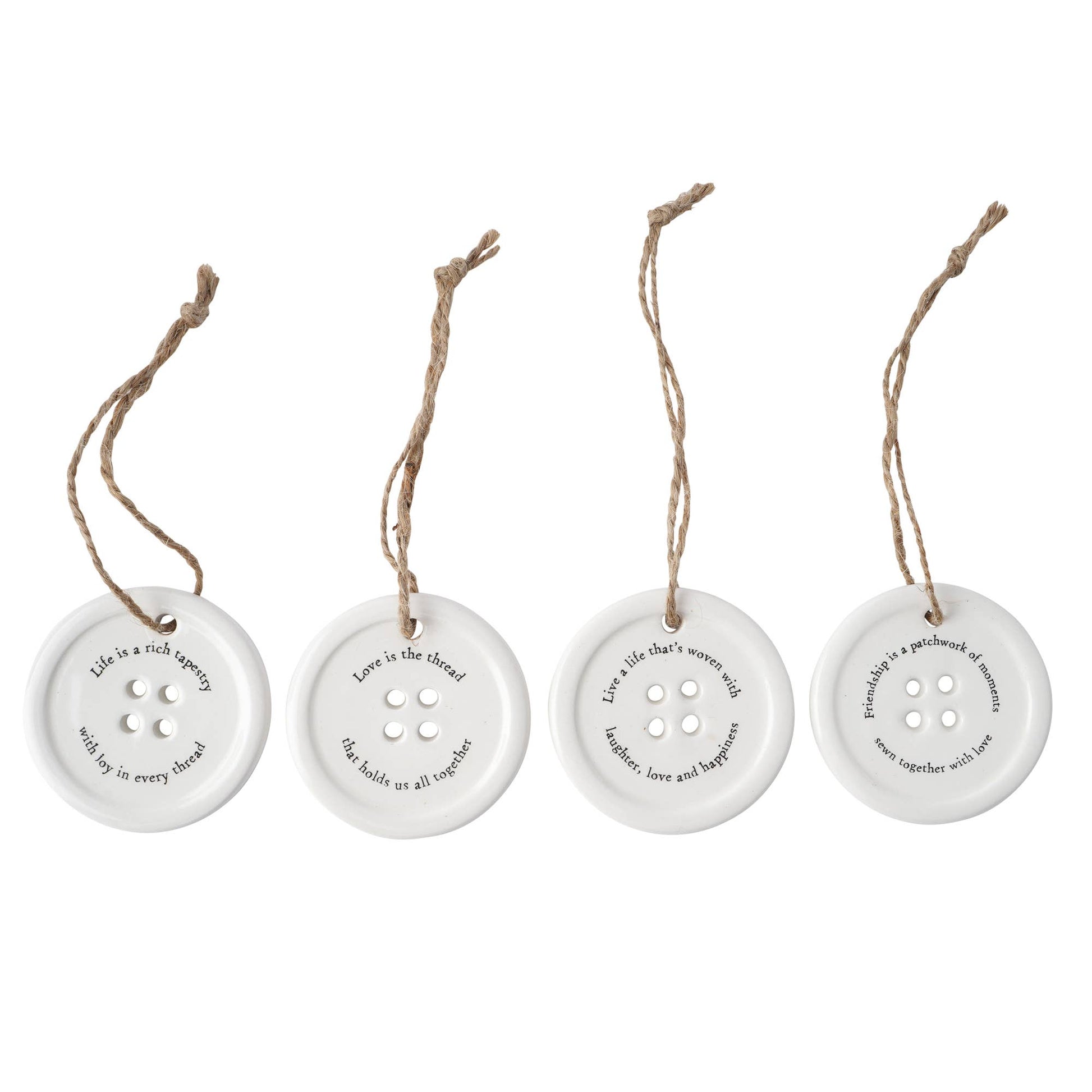Add charm and inspiration to any space with this delightful ceramic display dish containing 8 assorted button-style hanging decorations, each featuring its own unique slogan.