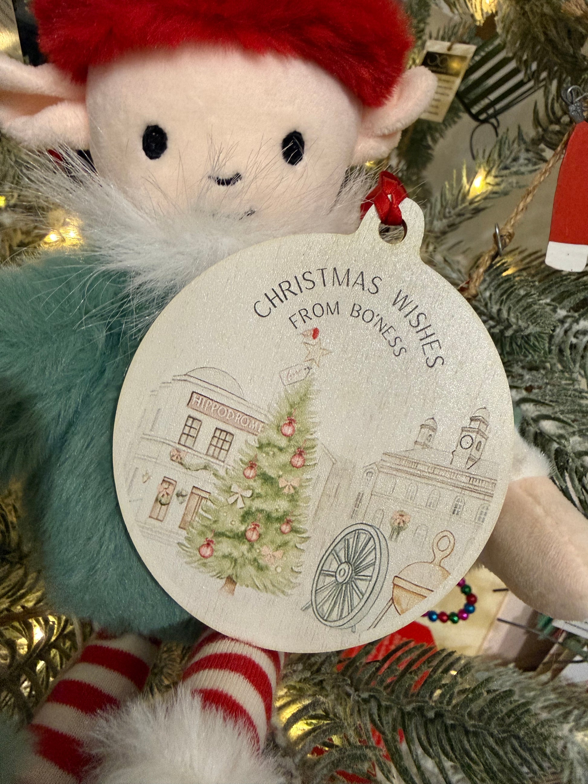 The bauble has a warm wood edge, a crisp white background, and a festive red ribbon so it’s ready to hang straight on the tree. Perfect as a keepsake, a gift, or a little nod to our lovely town.