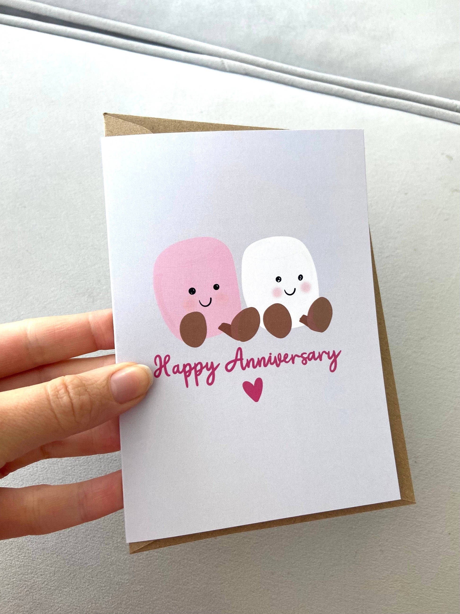 A6 anniversary card featuring two marshmallows on a grey background. It also features the words "happy anniversary" in pink writing. The card comes with a kraft brown envelope and is blank on the inside. It also features the Gallerybylara branding on the back of the card.
