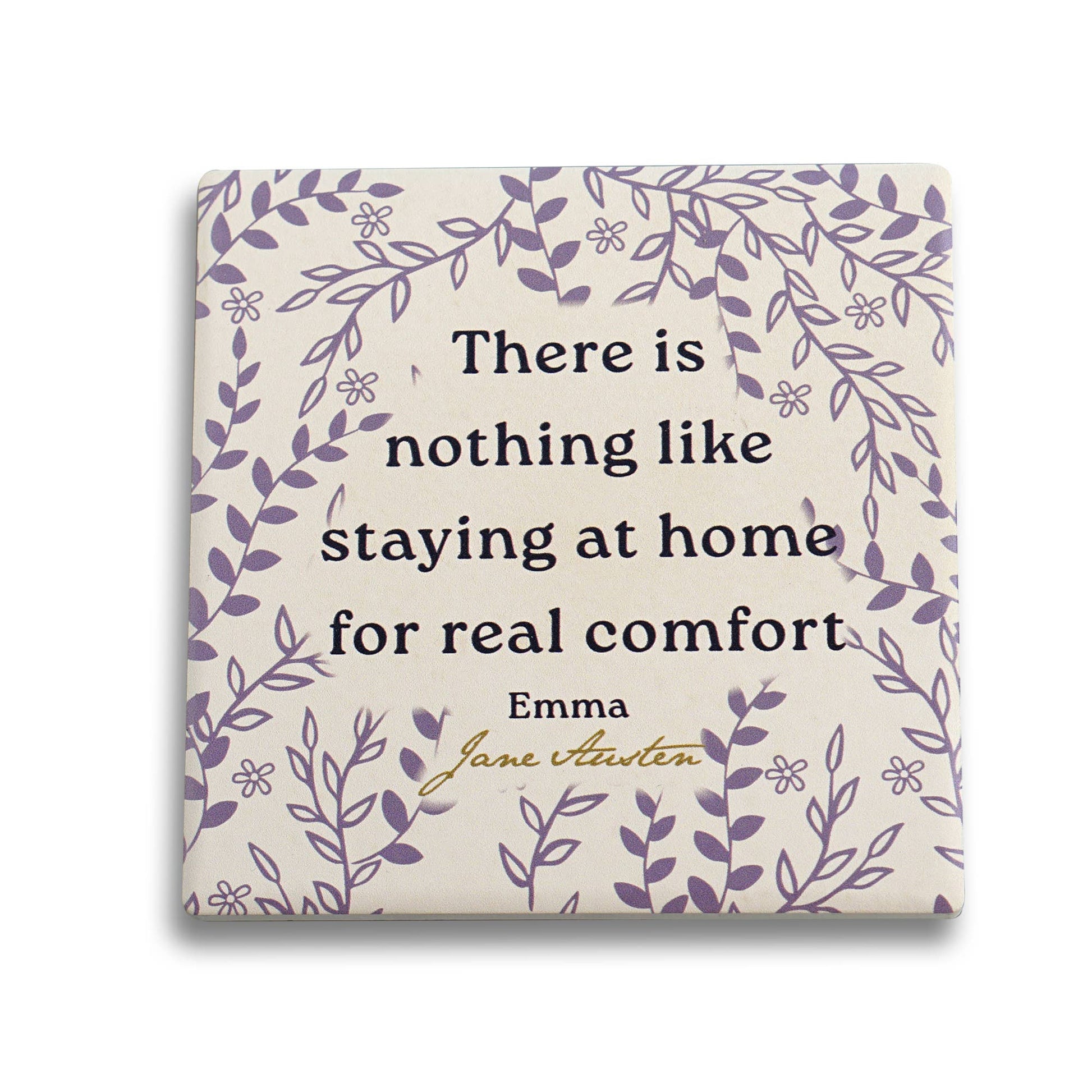 Dimensions: 0.7(h) x 10(w) x 10(d)cm * Packaging: Sticker * Composition: Ceramic * Care Instructions: Gentle handwash only, do not soak, air dry This cream coaster features delicate purple leaf illustrations and a thoughtful quote from Jane Austen’s Emma, combining literary charm with elegant design. A lovely gift for readers and a refined addition to any Austen themed display.