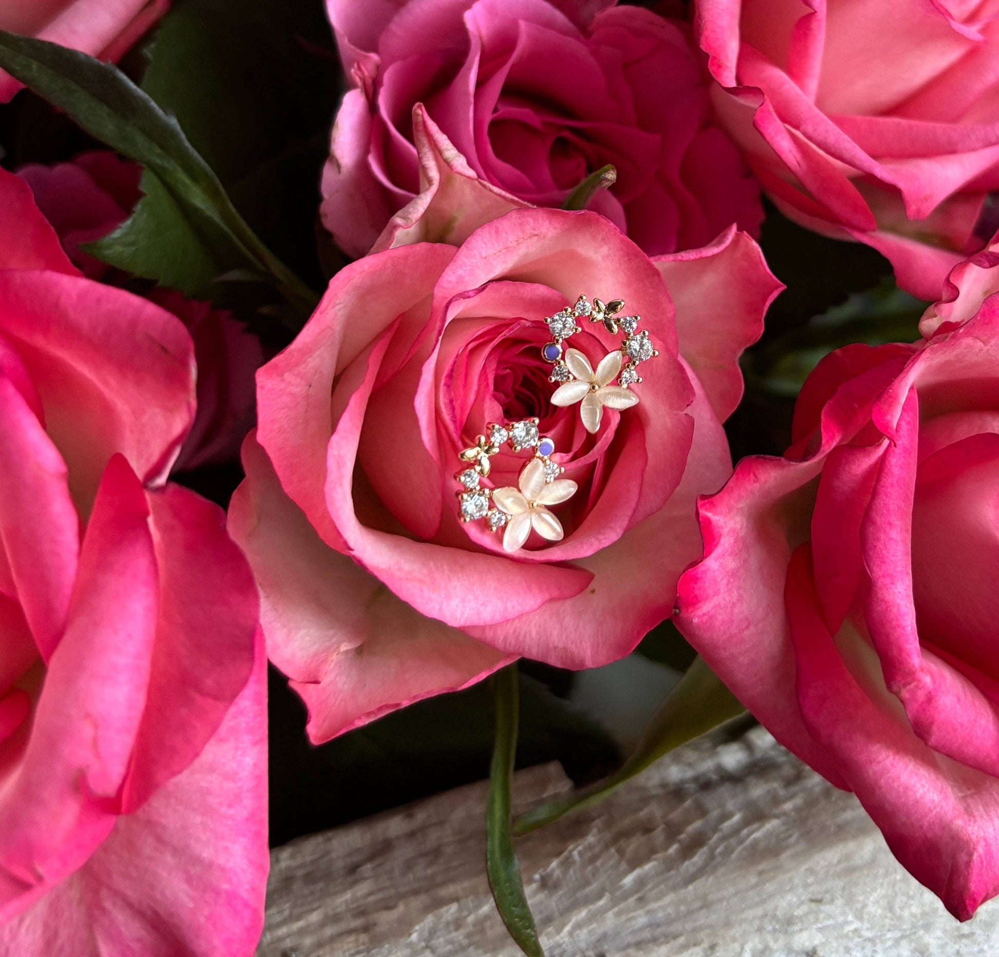 Cubic Zirconia wreath stud earrings with a peach flower accent. Sparkling, feminine, and perfect for any outfit.