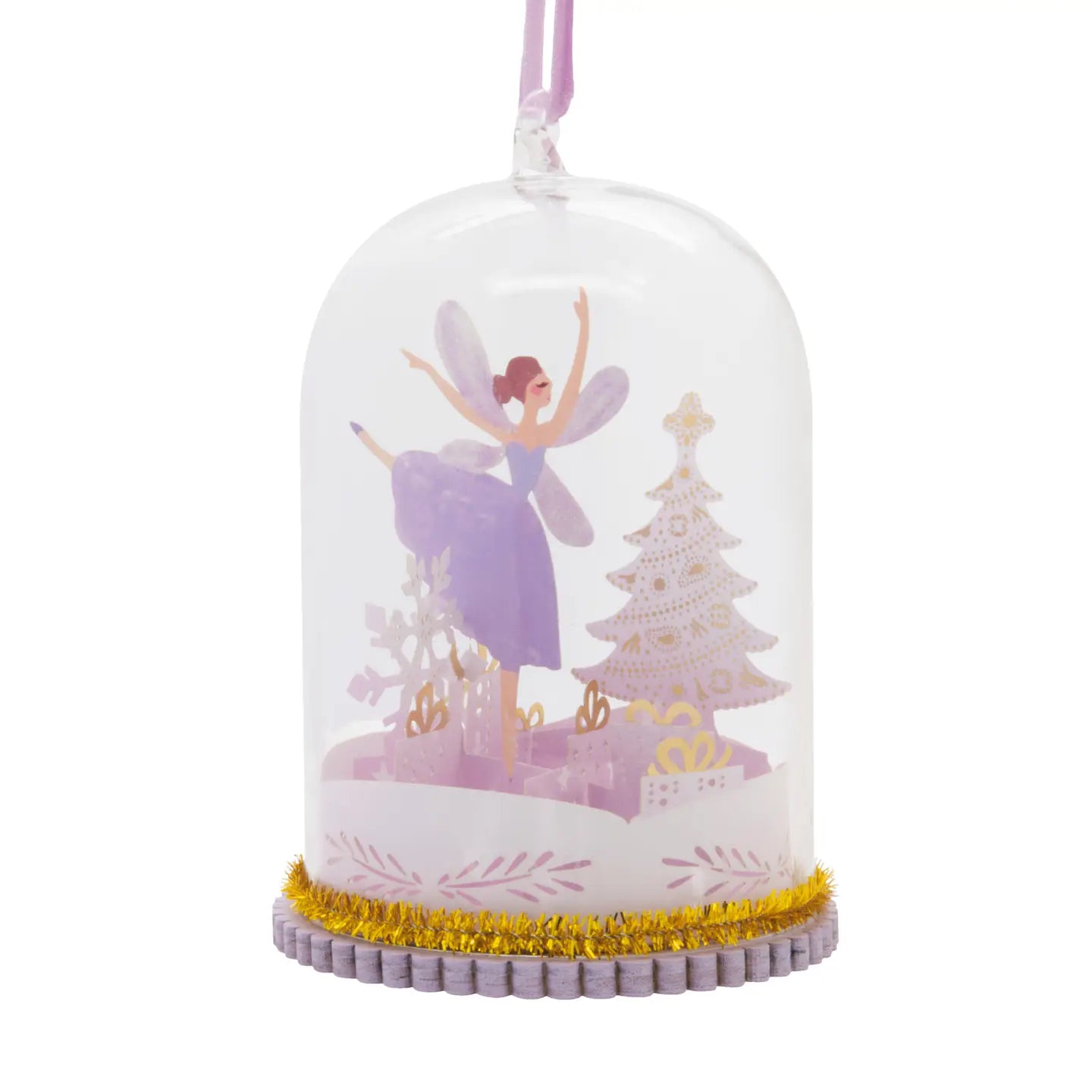 Bring the joy of fairy tales and pantomimes into your home with this sweet Dancing Fairy Hanging Ornament. Perfect for hanging up on your tree or with your décor this Christmas. This Signature Christmas Tree Ornament features a paper dancing fairy, a Christmas tree and present boxes design showcased inside a glass cloche. This ornament includes a co-ordinating pale purple velvet fabric ribbon and a gift box with a 'To & From' section on the back. Hallmark Ornaments are a great way to commemorate hobbies, life events and individual interests in movies, games and more. Each festive and collectable ornament is perfect for sharing with family and friends. Ornament Measures: H11cm by W8.2cm by D8.2cm This is not a toy. For decorative use only. This decoration is made of glass. Keep away from young children and babies.