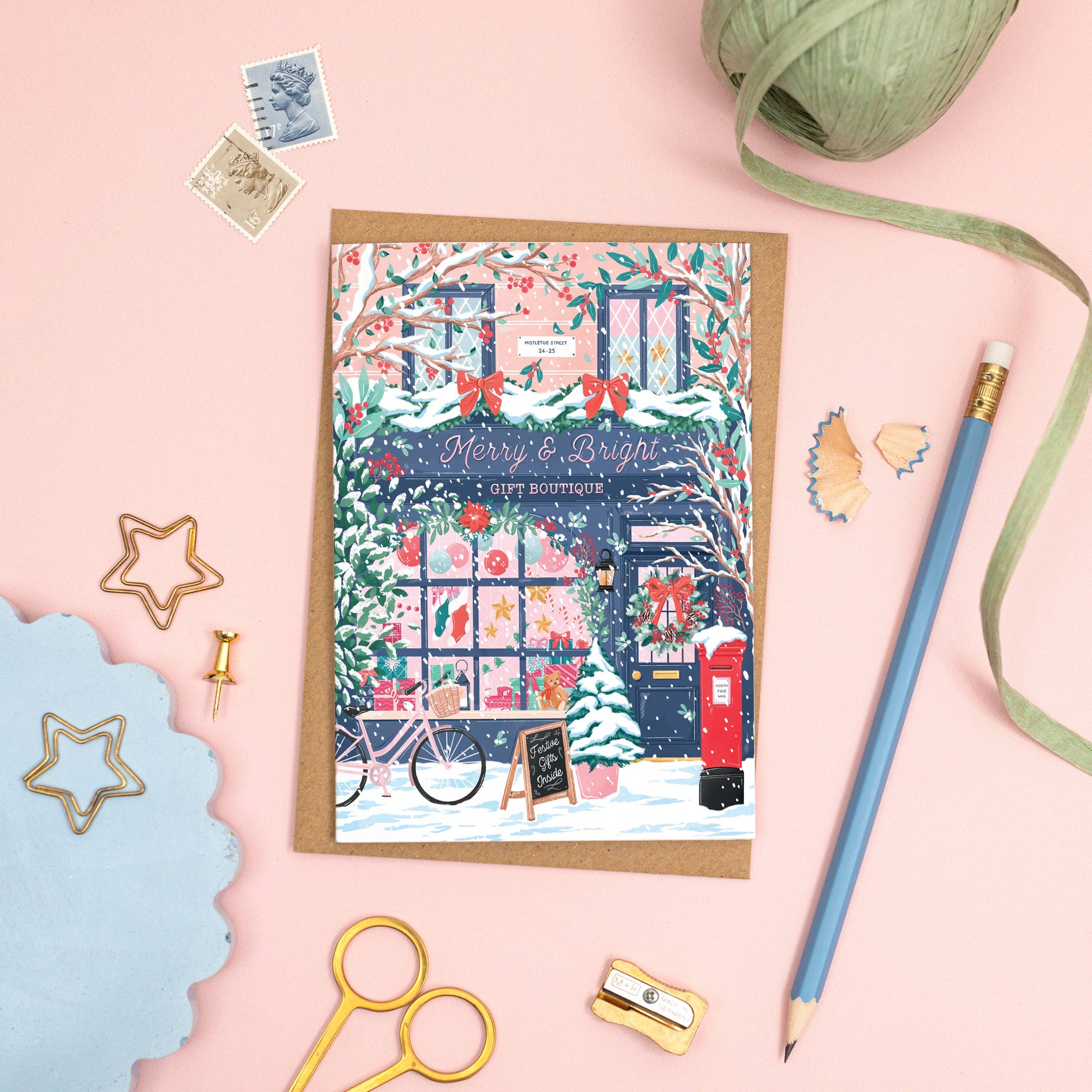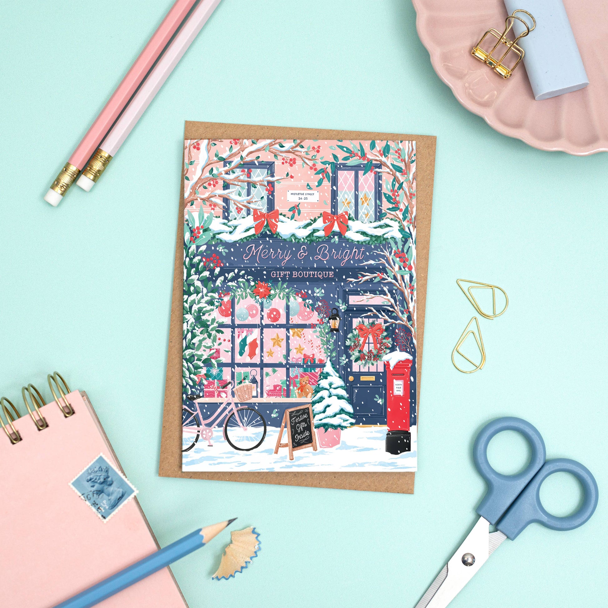Share the magic of the holiday season with our Gift Boutique greeting card, featuring a whimsical winter storefront adorned with festive decorations. This beautifully illustrated scene showcases a cosy shop with garlands, wreaths, and a classic red postbox, all set in a snow-covered wonderland. Perfect for sending warm wishes to friends, family, or anyone who appreciates a charming holiday scene.