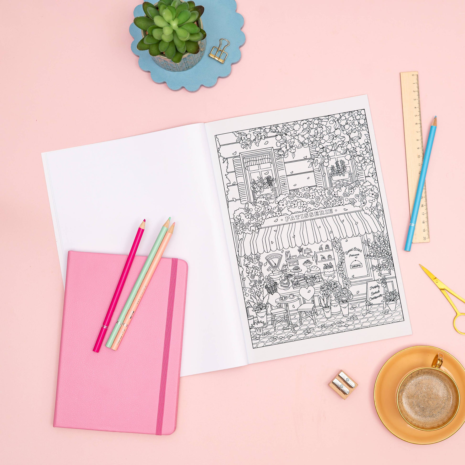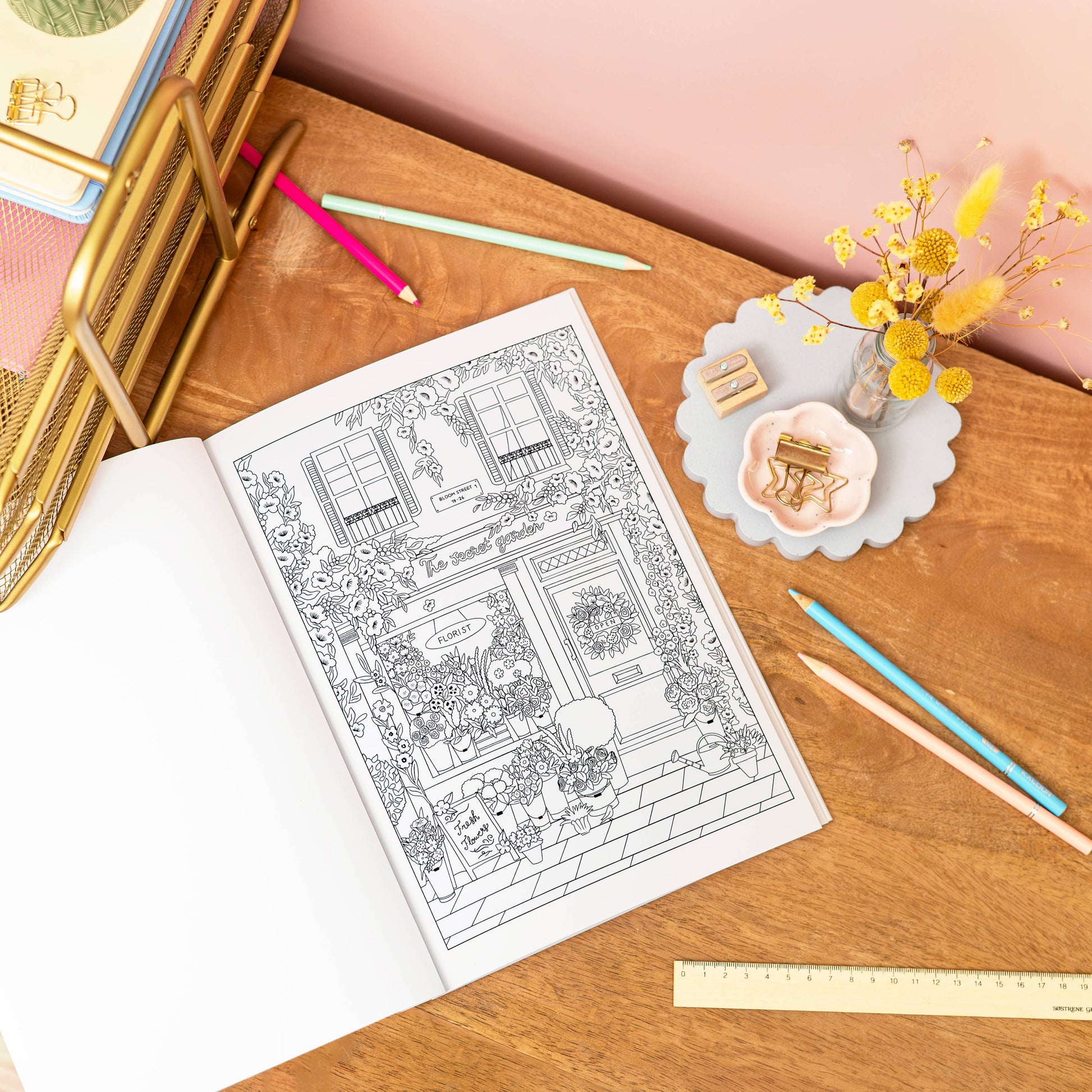 A beautifully illustrated A4 colouring book featuring 20 original shopfront scenes by Simply, Katy — printed on premium 200gsm paper and designed to be treasured.