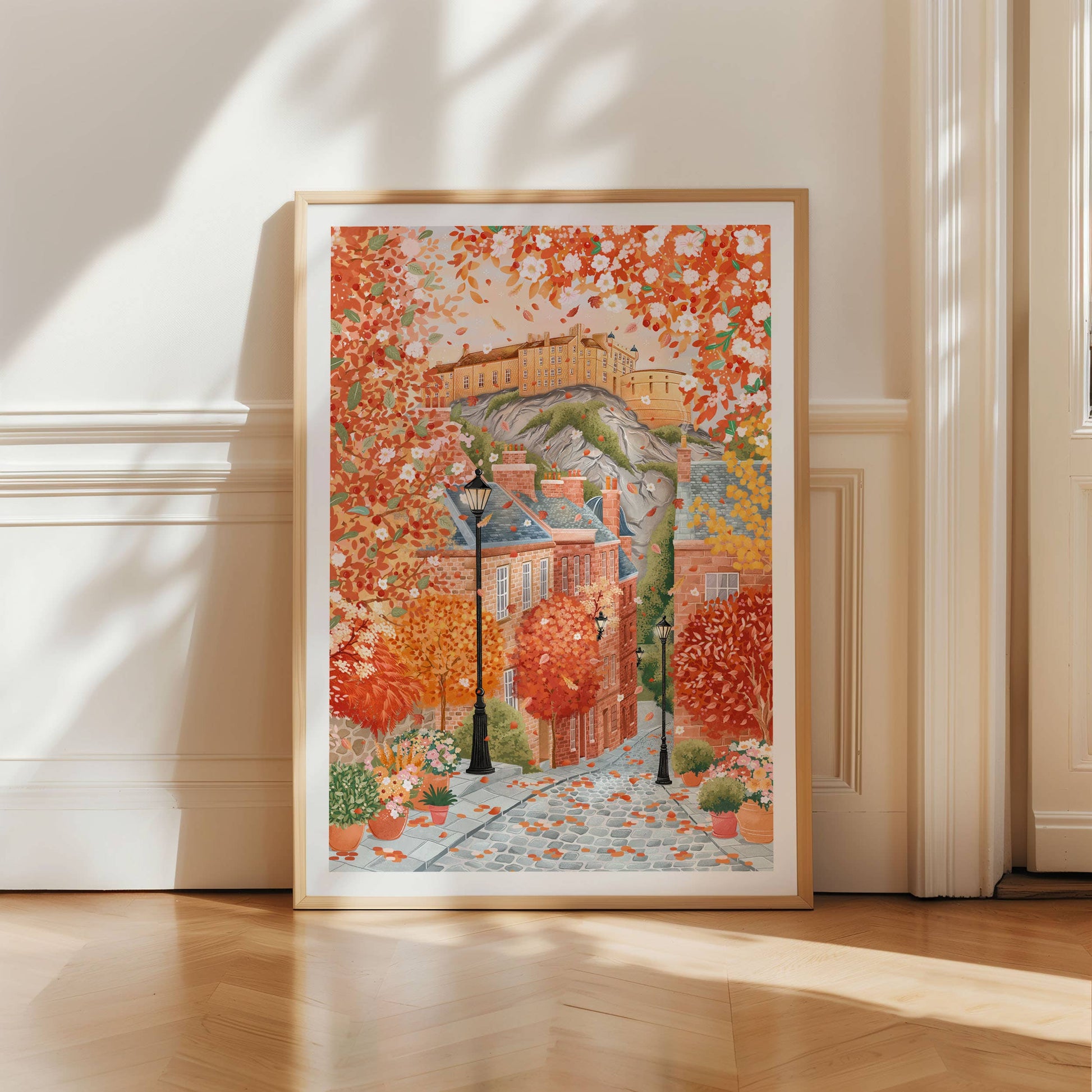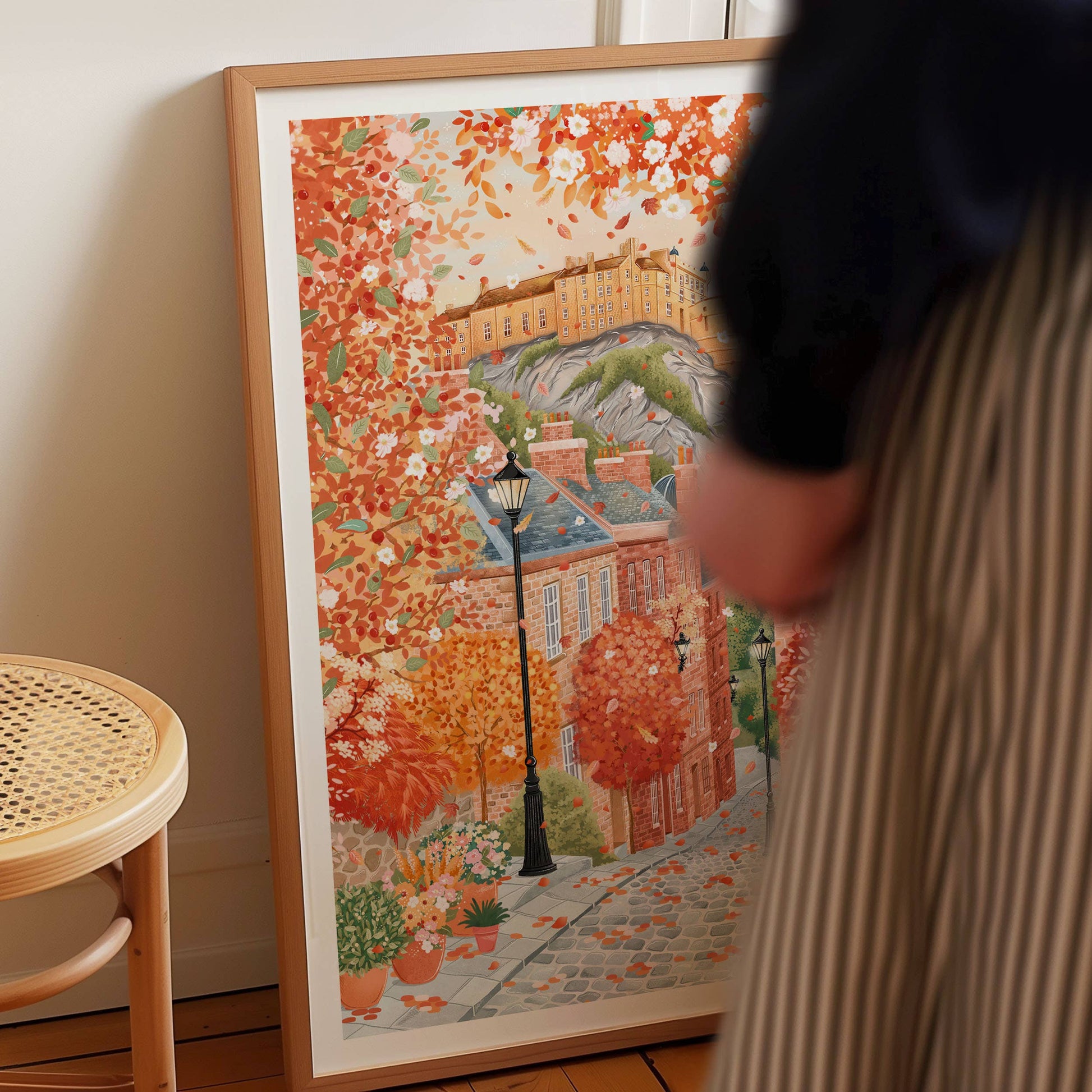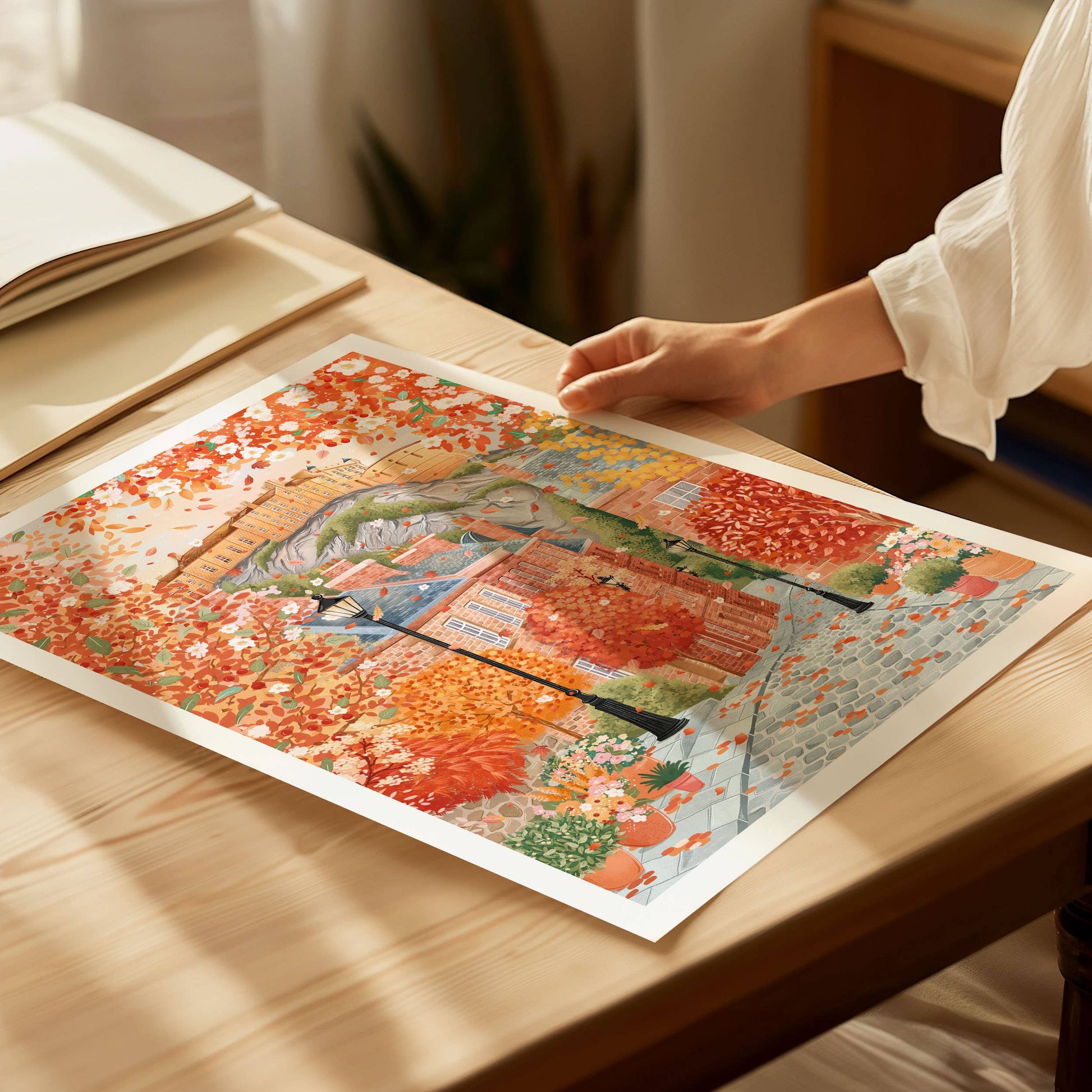 The rich palette of burnt orange, deep red, and golden yellow makes this illustration the perfect way to add a cozy, autumnal touch to your home—whether you’ve wandered these historic streets yourself or dream of visiting one day.