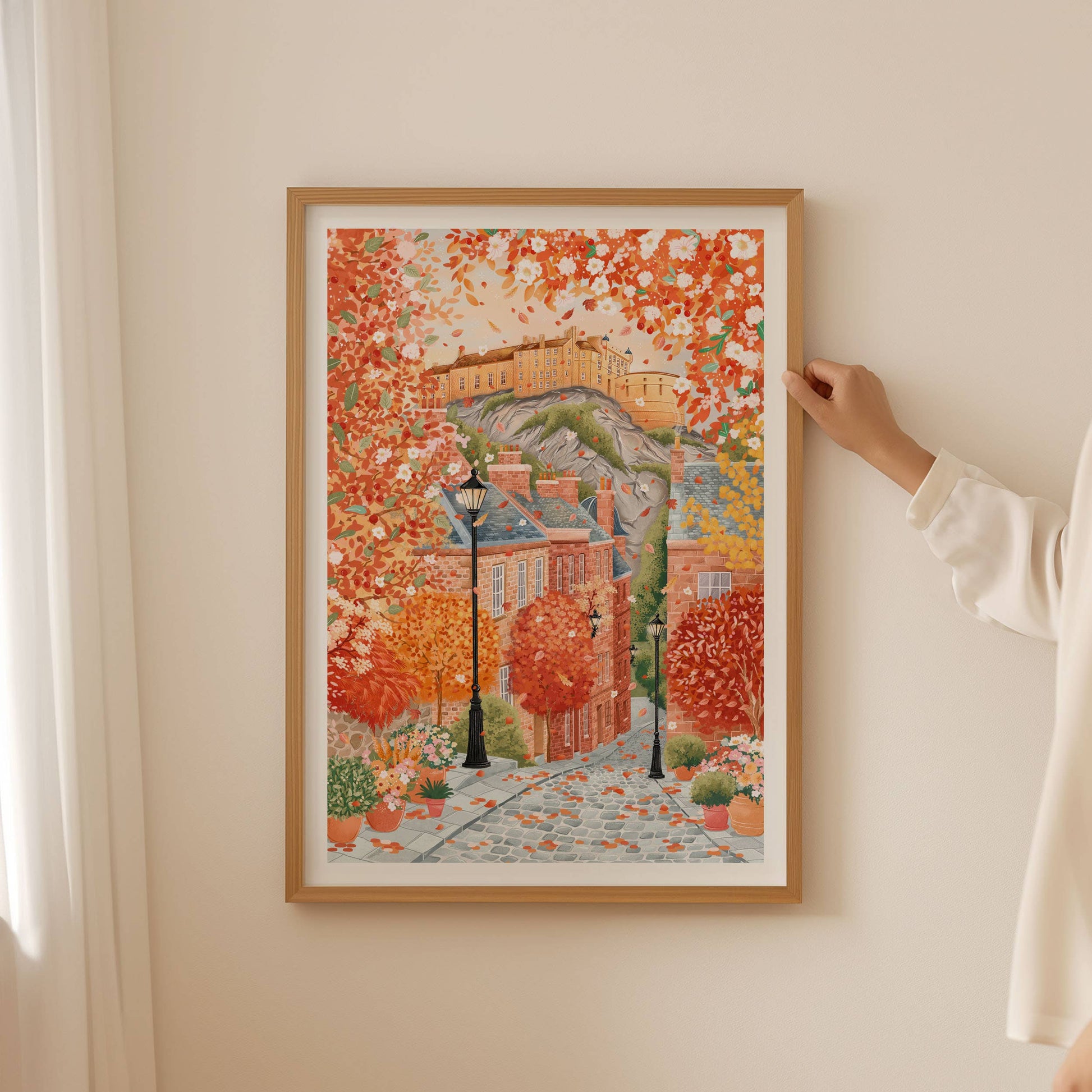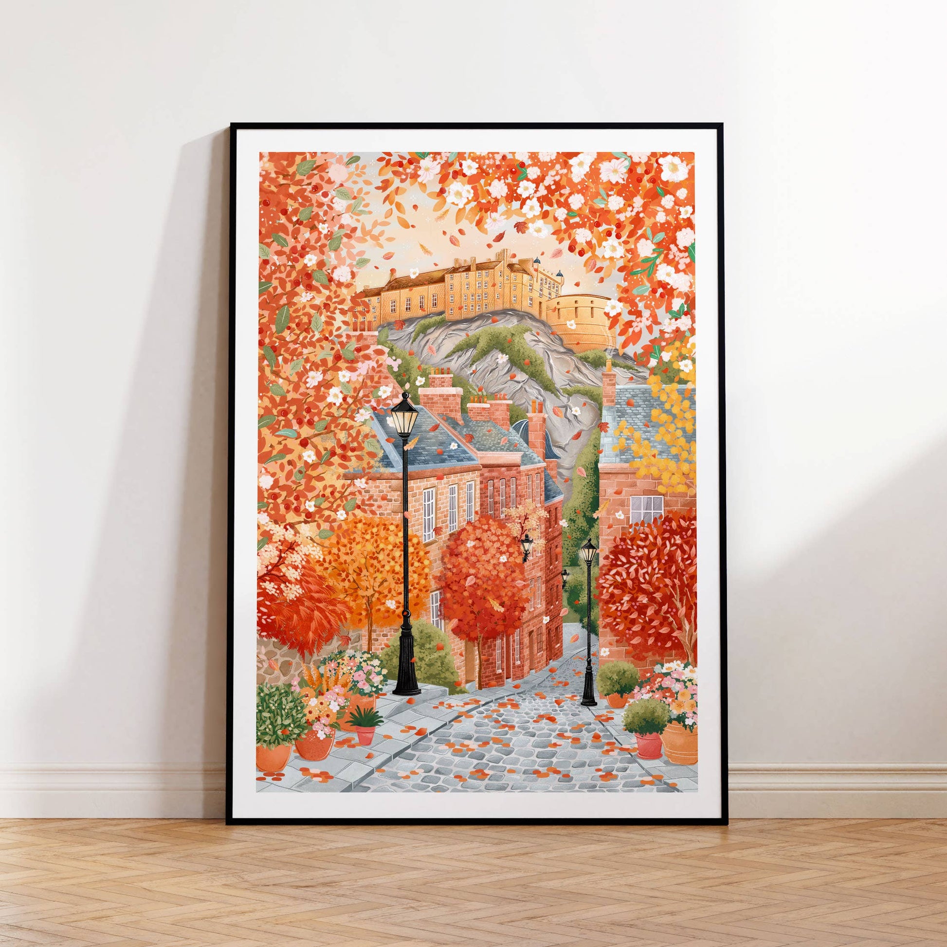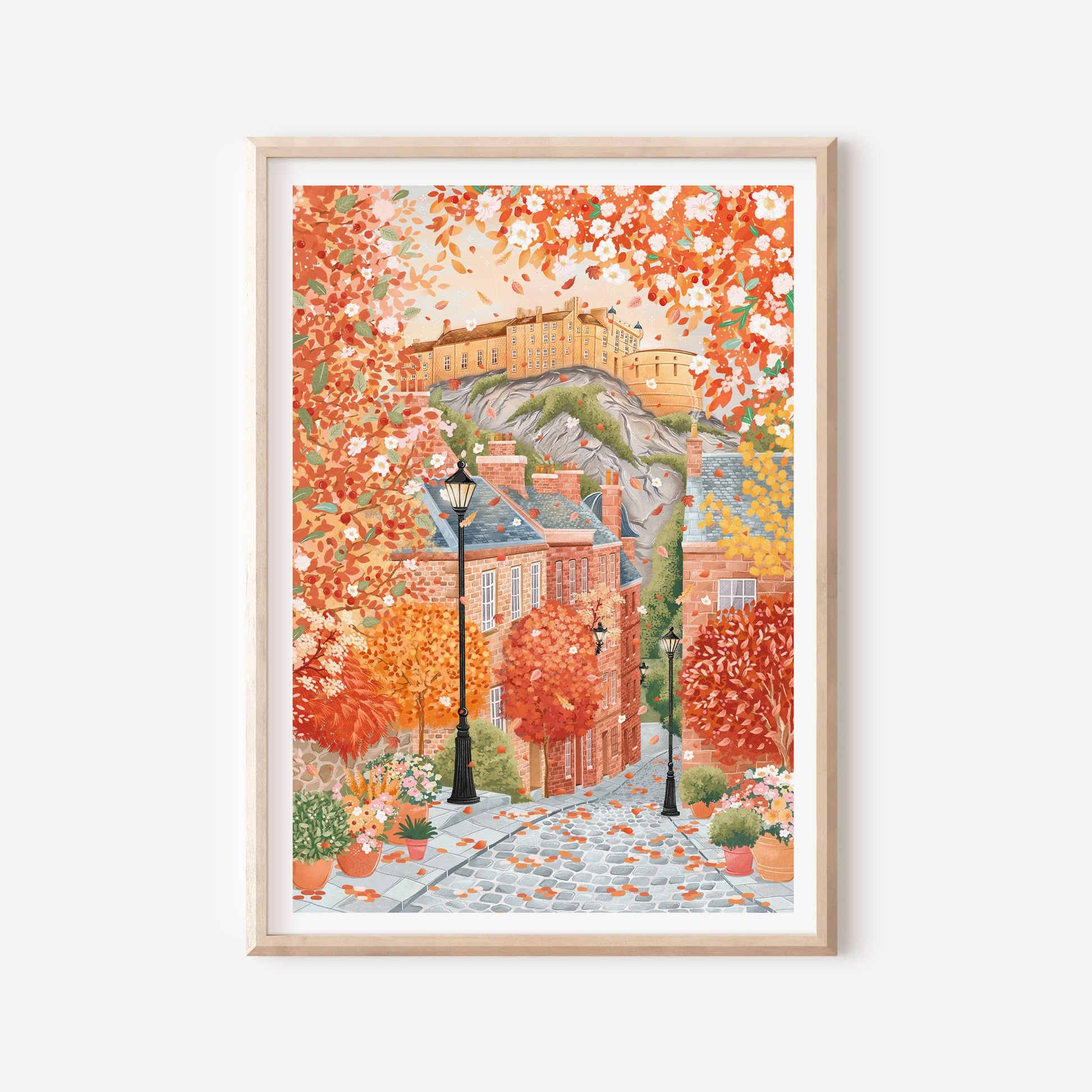 This charming art print captures the beauty of Edinburgh during the golden days of autumn, illustrated by Simply, Katy. Inspired by the view of Edinburgh Castle from the cobbled streets below, the piece is filled with warm seasonal tones, intricate architectural details, and vibrant foliage that brings the scene to life.