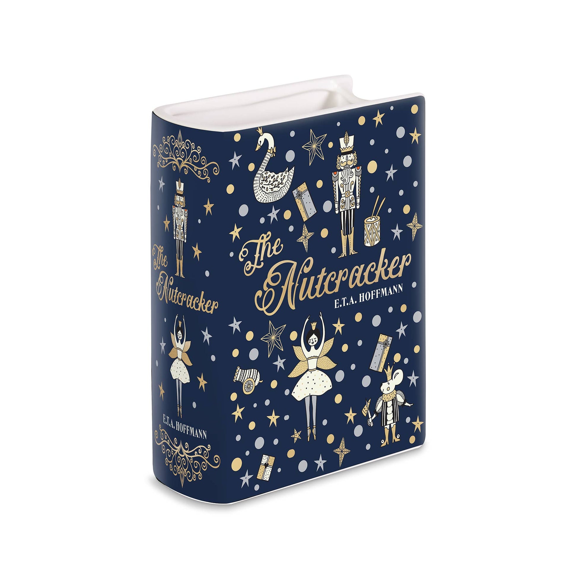 Take your love for classic novels one step further with our ceramic decorative book vase. Featuring artwork influenced by E.T.A. Hoffman's beloved story The Nutcracker and a multifunctional design, this unique ceramic vase is sure to dress up any room. Crafted with meticulous detail, it features a wrap-around design inspired by classic books, with molded page details and a poignant quote from a beloved novel on the back. Fill this large ceramic vase with fresh flowers or your favorite writing utensils to adorn your space with the most practical bookish charm and holiday magic.