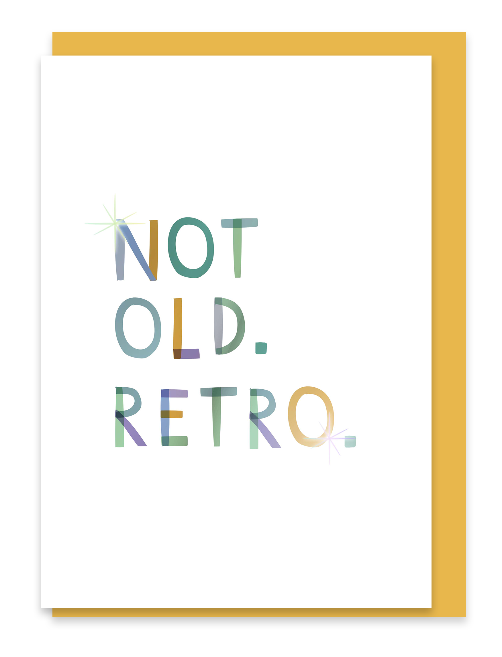 A brilliantly bright birthday card, this card reads ‘Not Old. Retro’, and is made with my hand-drawn typography, finished in a brilliantly shiny dig-foil, with a colour overlay in greens, blues and yellows. Perfect for those young at heart!